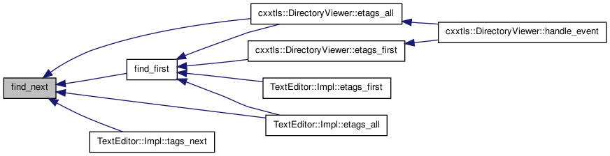 Find next is the same as find_first except that it does not allways start at the beginning of the tags database when doing searches -- rather it starts at the location just passed the most recent find first operation.